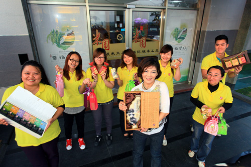 透過包裝,米在食用價值之外,多了視覺的美感。圖為米圃執行長林璐和員工一起展示經過設計的小包裝米禮盒。