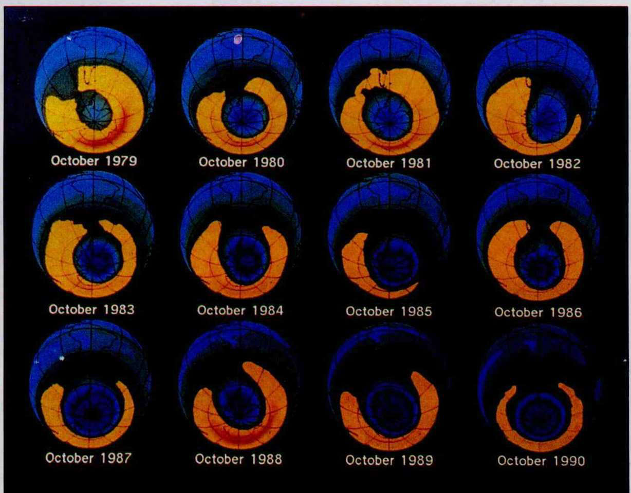 「補天」已經刻不容緩。圖中顯示一九七九至九○年,每年十月的大氣狀況。南極上空的紫色部分即是所謂的「破洞」。(美國國家航空暨太空總署提供,張良綱翻拍)