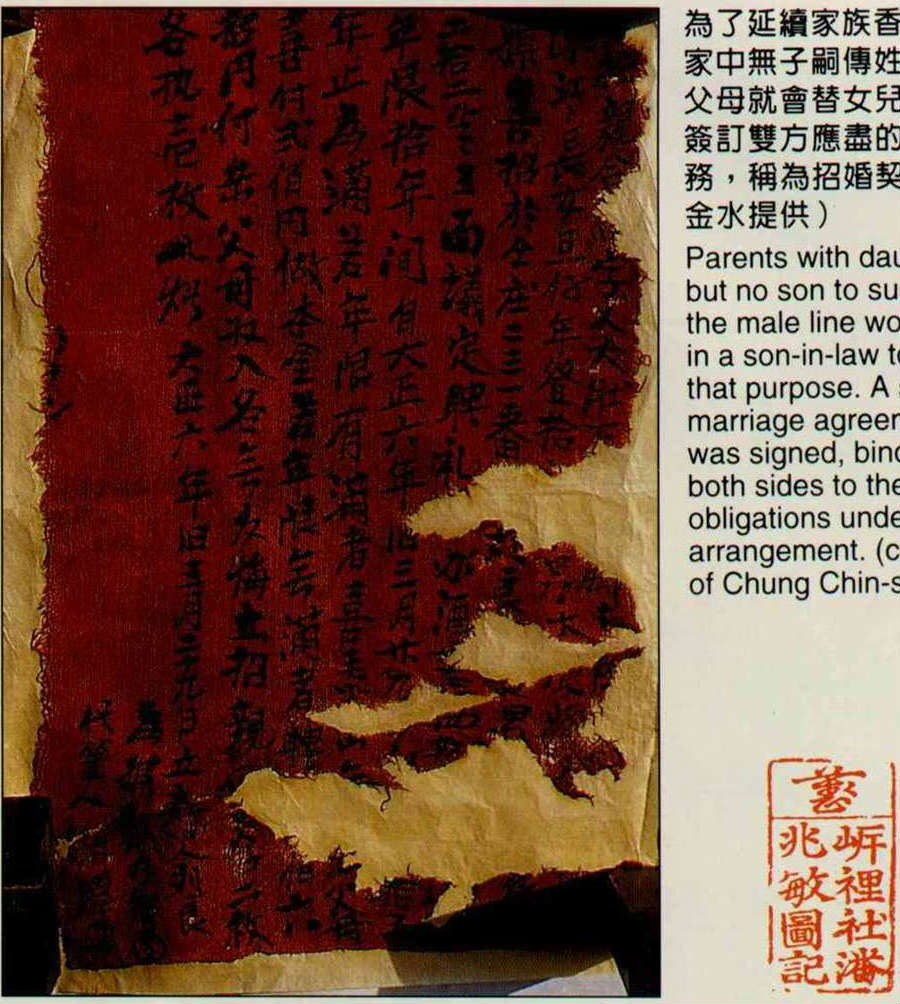 為了延續家族香煙,當家中無子嗣傳姓氏時,父母就會替女兒招婿,簽訂雙方應盡的權利義務,稱為招婚契。(鐘金水提供)(鐘金水提供)