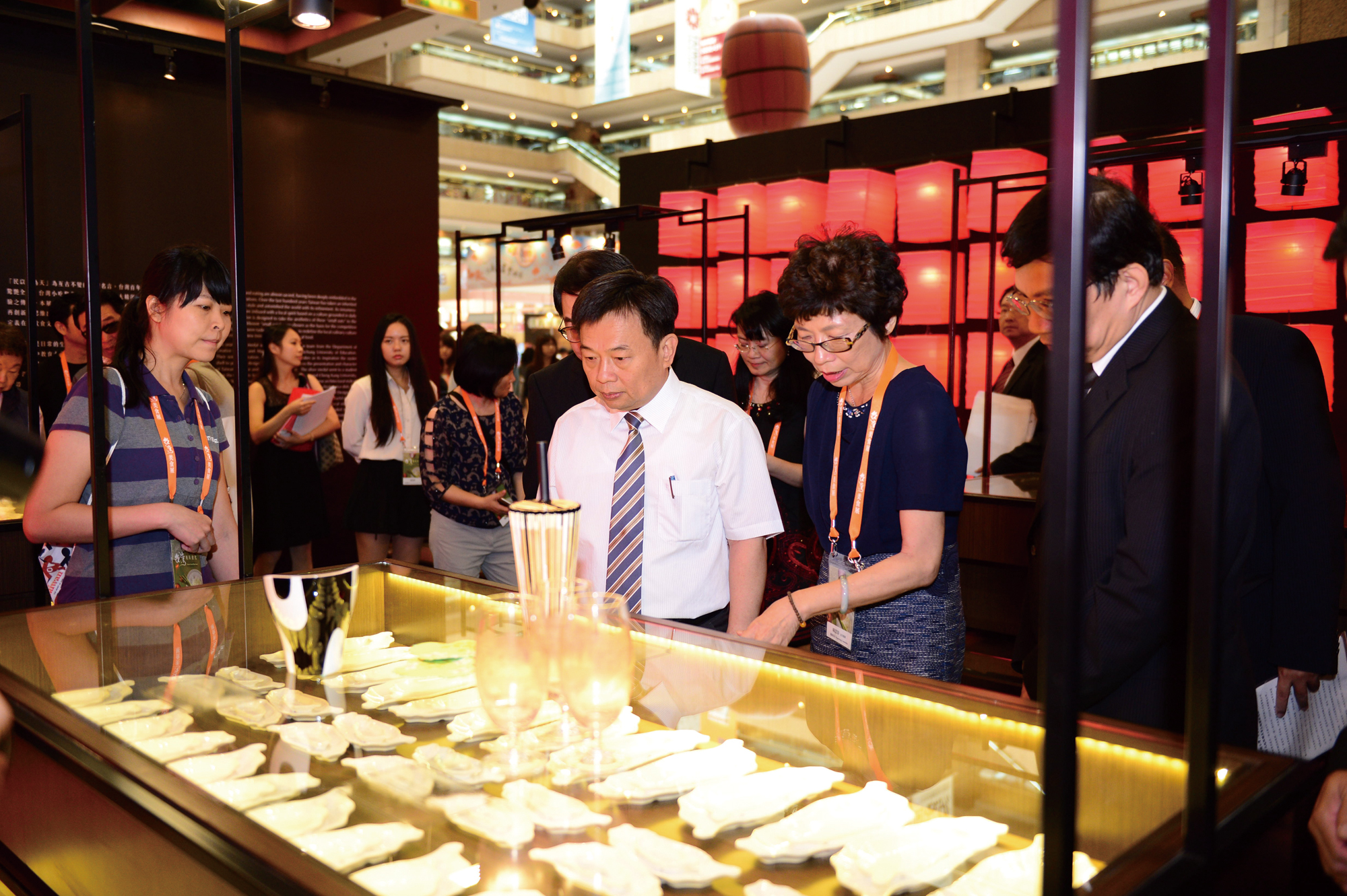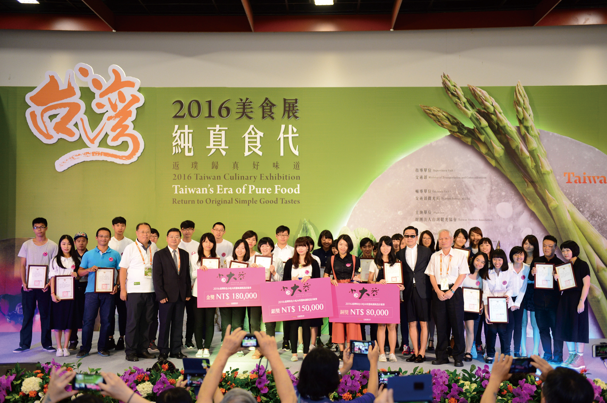 獲獎作品於「2016美食展」上展列,台灣觀光協會會長賴瑟珍(右二)陪同行政院副院長林錫耀(中)參觀「小吃大器」作品展。