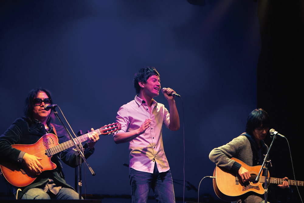 2012年走江湖音樂節,大陸盲人歌手周雲蓬、陳永龍與萬曉利(由左至右),帶給台灣樂迷一場新民歌洗禮。