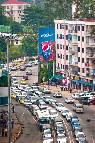 其中又以可口可樂的動作最積極,因為該公司早在1927年就曾在緬甸設廠,直至二次大戰爆發才撤出,經歷了緬甸近一甲子的政經波瀾後,終於得以重返此地;在可口可樂宣布重返緬甸的幾個月後,仰光街頭已處處可見布滿紅(可口可樂)、藍(百事可樂)飲料罐的大型廣告看板。