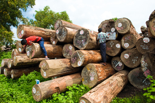 擁有豐富的天然資源,緬甸成為國際投資的焦點。圖為鄰近仰光市的勃固省合板廠,相關部門正在為樹木標記生產地履歷。