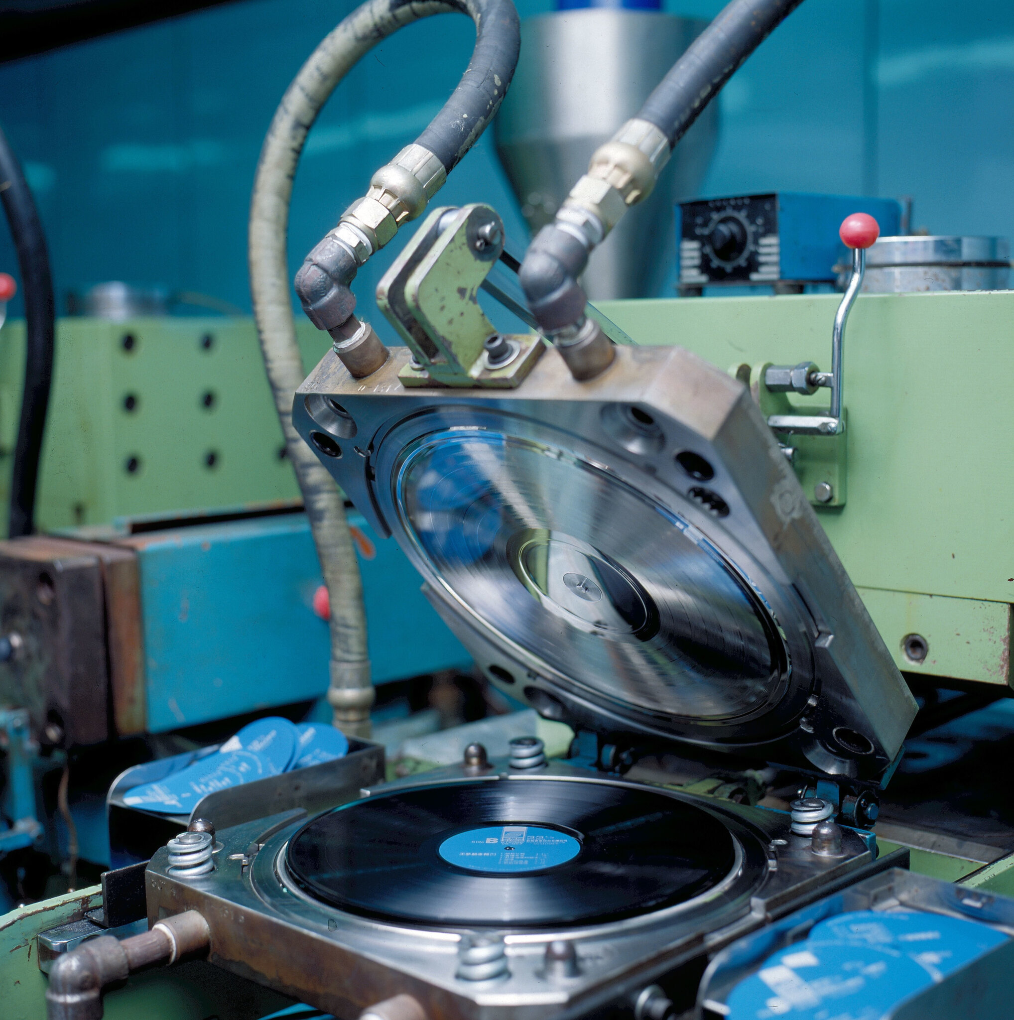 一個唱片有正反兩面,因而有上、下兩個模版。在壓製唱片時,兩個模版分置上下,然後將唱片的原料——溶融的乙烯塑膠,經由細管送到二個模版之間,然後一壓就成了一張唱片成品。