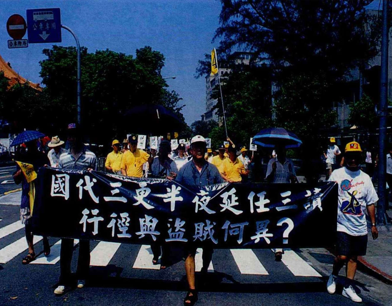 國大延任案通過之後,民情激憤。圖為新黨所發動反國大延任、自肥大遊行。(薛繼光攝)