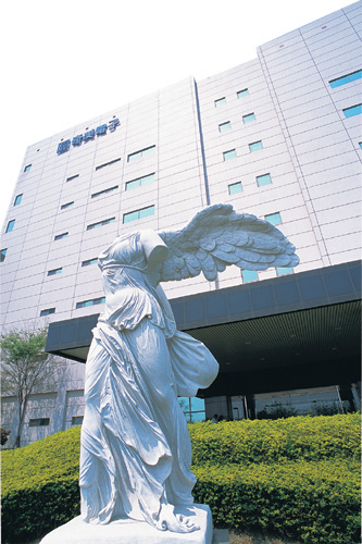 走過南科園區的奇美光電廠房旁,很難不注意到週遭的希臘諸神雕像。這座仿羅浮宮收藏打造的勝利女神,均衡的美感為方正的光電廠房增添了風景。