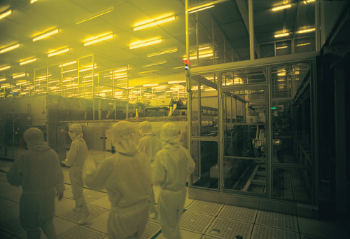 液晶面板製程的80%與晶圓製造相同,唯一不同的是加工的材料由晶圓換成玻璃基板。圖為瀚宇彩晶台南廠內「黃光區」裡的作業員工。