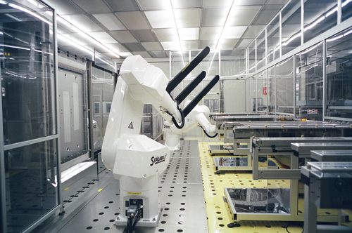 絕對潔淨、絕對精密,無論是機器設備或是作業人員,脆弱的玻璃基板製程要求絕對的嚴謹。面板廠內負責搬運玻璃基板以進行加工的機器手臂。(奇美電子提供)