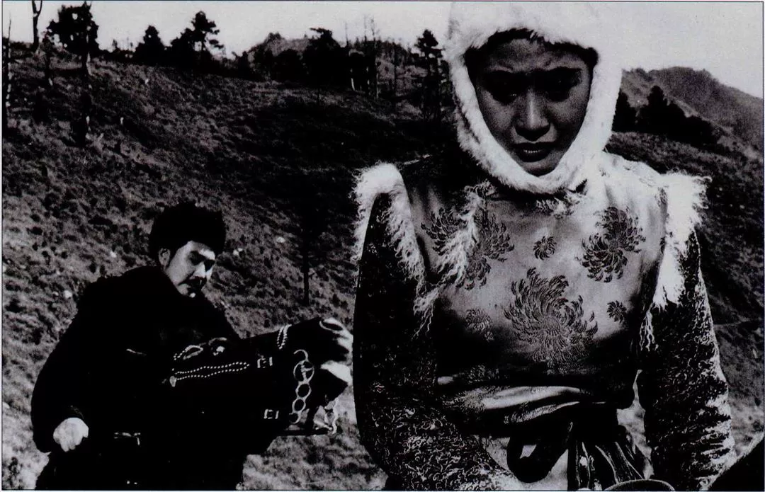 這是一張堪稱佳作的典型劇照:畫面中有二位人物,且面對讀音。在構圖中,很容易瞭解它「兒女情長」的主題。女主角不忍男主角離去,無奈他身負重任,需捉回山賊。她不禁暗自流淚,卻不敢讓伊人看見。多有戲味啊! 張衝、丁紅.1964.〈山賊〉