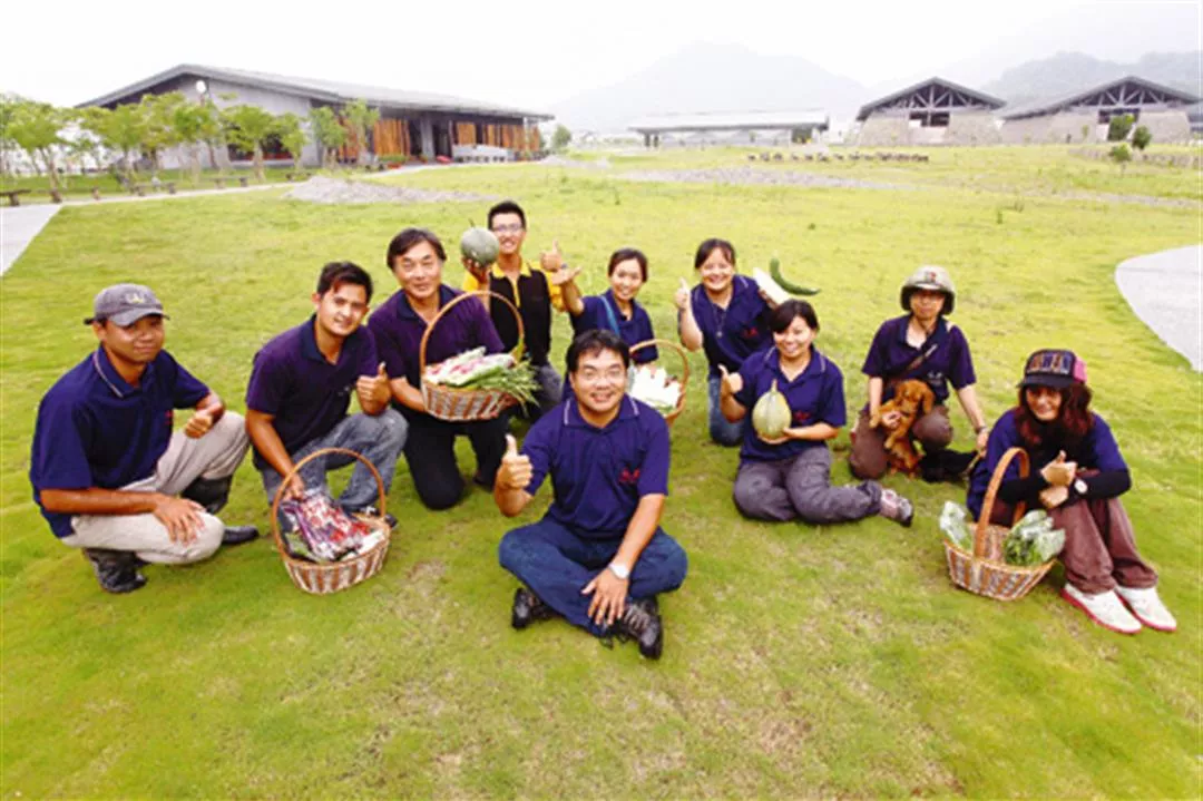在場長李惟裕(中坐者)和員工的努力下,高雄永齡農場由一片荒地變身為全國最大的有機蔬菜農場。