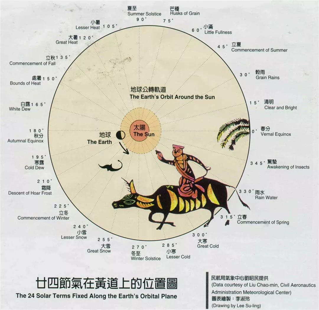 為了更求精準,「二分」「二至」中間,慢慢又插進所謂的四立日(立春、立夏、立秋、立冬);繼續推演下去,最後大約在西漢年間,先民將地球公轉太陽一圈的三百六十度,每十五度訂為一個「節氣」,並且依各節氣的天候特徵取名,建立了廿四節氣的說法。
