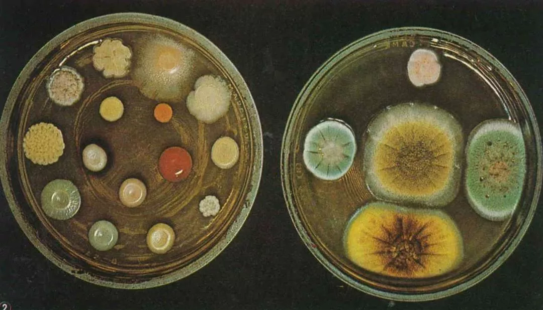 圖2.:像不像麻糬?左邊培養皿上是十五種不同的酵母菌團,右邊則是黴菌菌落。(翻拍自Scientific American, Sept. 1981,許文輝提供)(翻拍自Scientific American, Sept. 1981,許文輝提供)