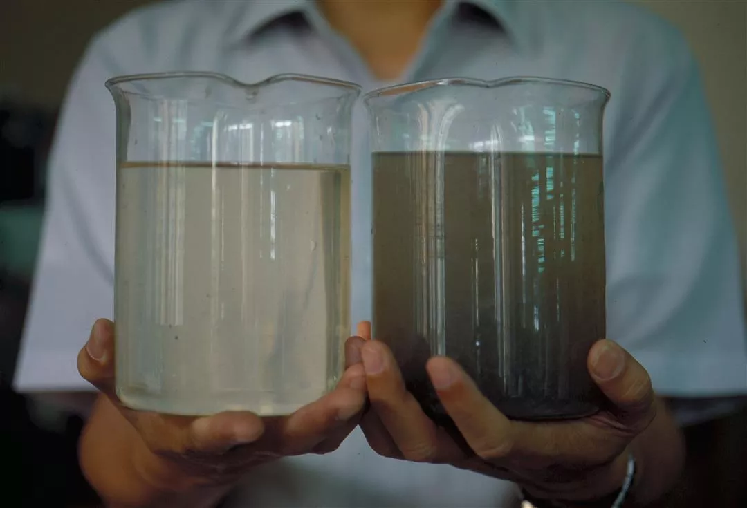 圖5.:只要髒水中含有有機物,細菌便能一展所長。右邊燒杯裝的是皮革廠廢水,經細菌處理後,即成為左邊燒杯裏的清水。(張良綱)