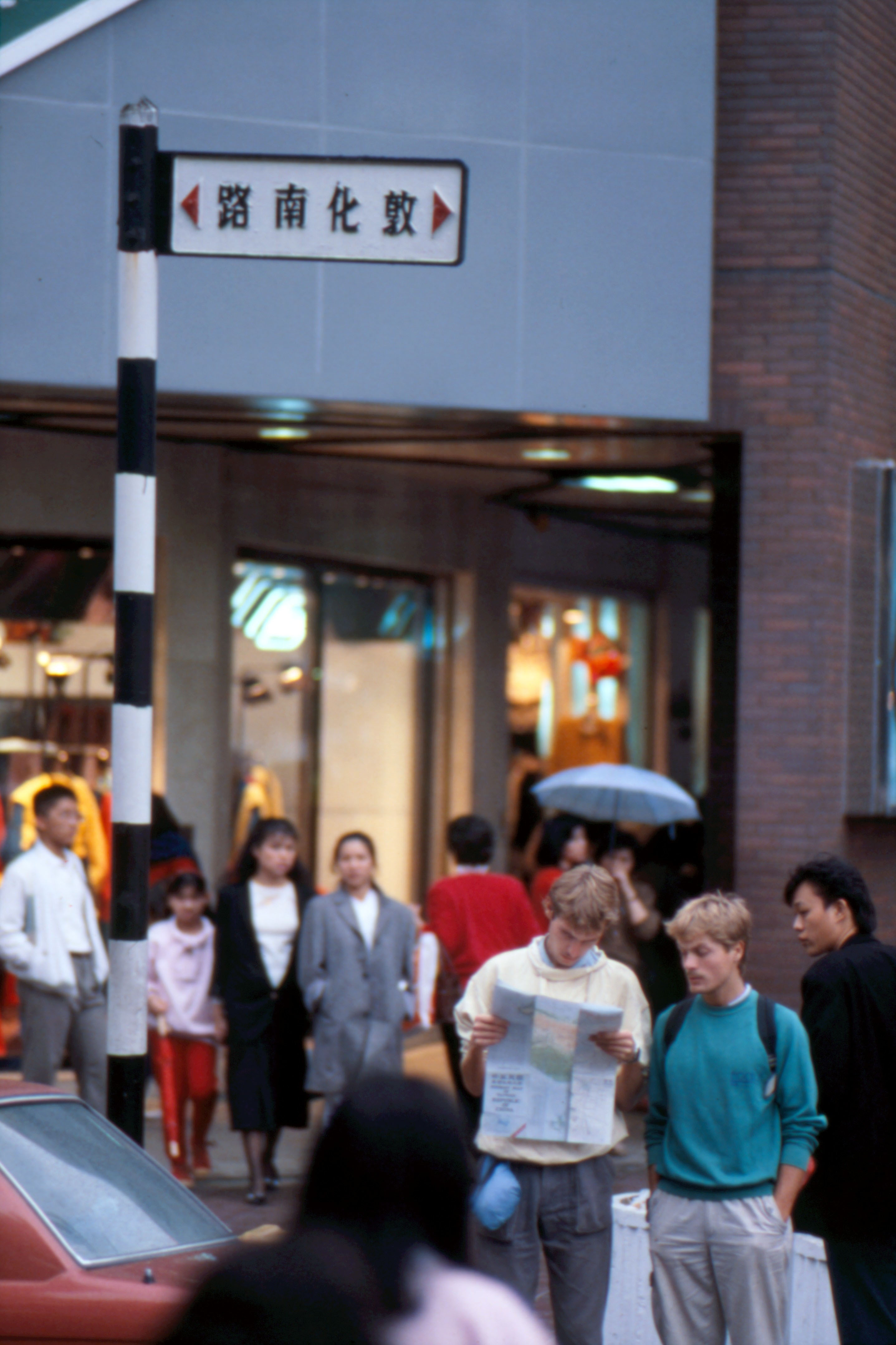 外籍旅行者迷失在台北市熙來攘往的馬路上,只好翻出地圖仔細研究一番。(張良綱攝)