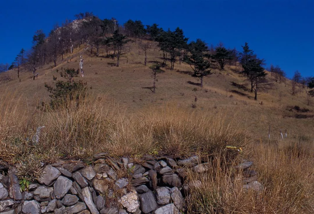 圖1.:八通關殘留的「人」字形石牆遺址,幾乎湮沒在茅草堆中。