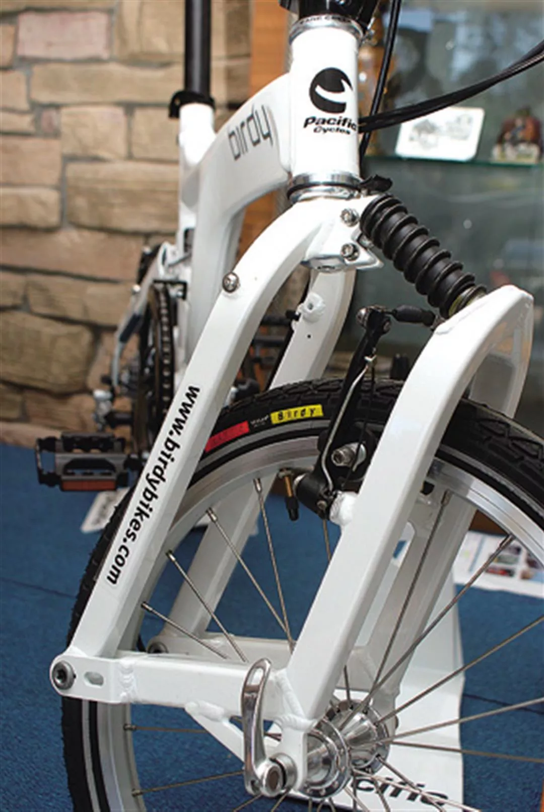 Birdy的最大特色在於──摺疊車中獨一無二、可以抵銷緊急煞車時前衝力道的「前叉旋臂避震」,顯眼的前輪雙梯形骨架設計,不僅讓Birdy在車陣中一眼就能辨識,而且避震轉軸就是摺疊轉軸,「一石二鳥」。