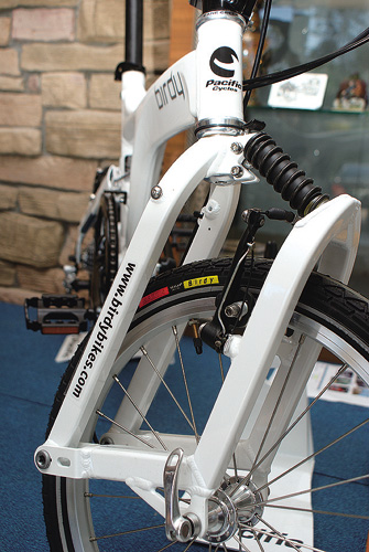 前輪的「前叉旋臂避震」設計,避震軸兼摺疊軸,「一石二鳥」,是Birdy的一大特色。