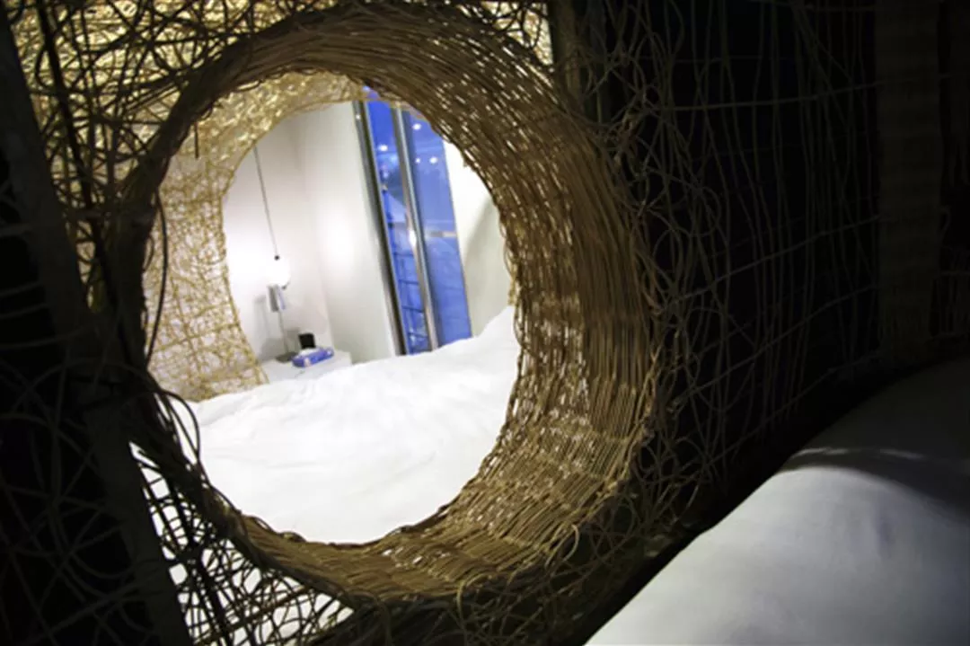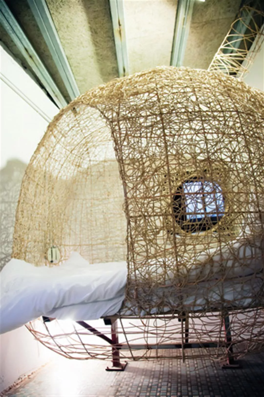 寶藏巖內設計成「蟻窩」般的住房,透過竹編大床,讓旅客在新舊交融中安睡。