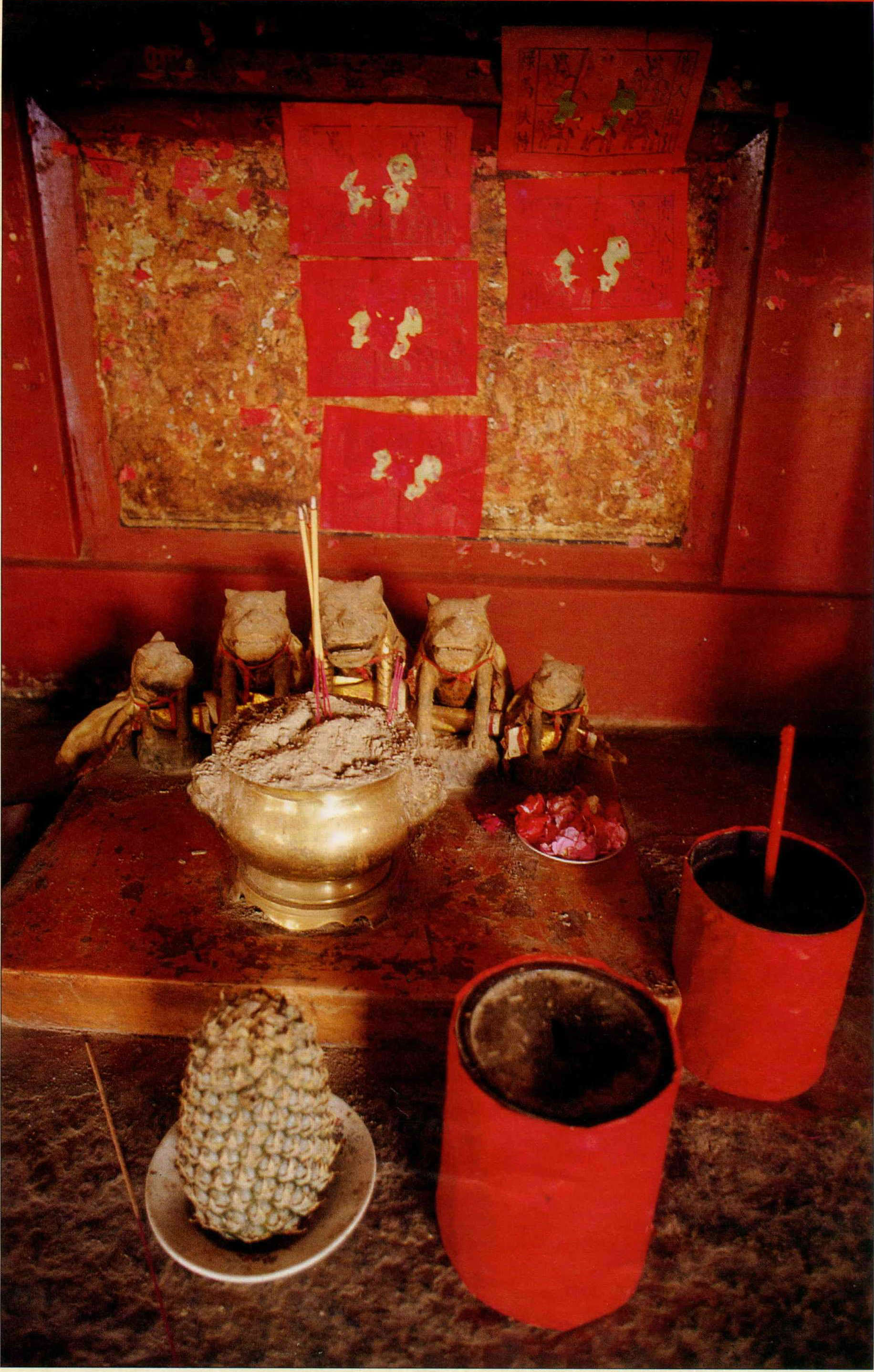 馬來西亞麻六甲的一座華人廟中,地上供著五隻大小不同的狗。