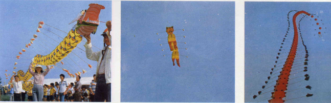 各式各樣的小型風箏,輕而易舉地便飛上了天空,悠遊翱翔。有些是翩然飛舞的蝴蝶,有些是搖曳生姿的美女,還有唯妙唯肖的老虎、青竹絲也在空中爭奇比巧。有的將竹削笛繫在箏首,迎風嘯鳴,更是別有一番情趣。