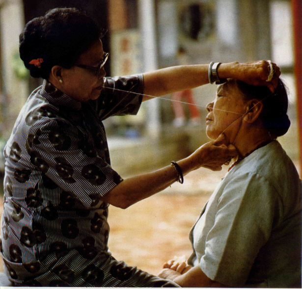陳金月女士在龍山寺表演的「挽面」,讓許多年輕小姐大開眼界。因為在美容院林立的今天,這種古老的美容術已經難得一見。