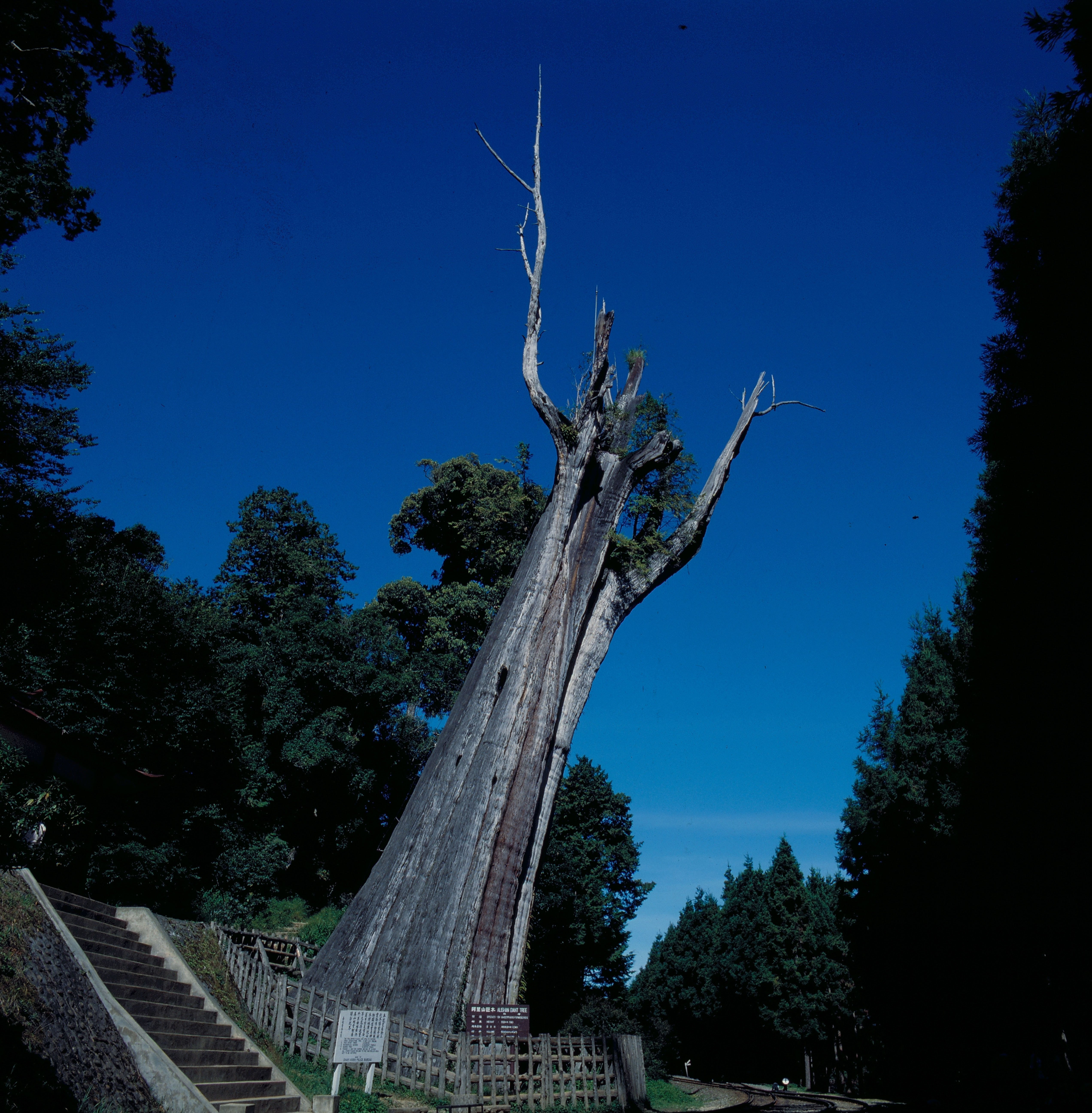 這是阿里山最有名的神木,樹齡高達三千多年,廿幾年前,它曾遭雷劈,已成枯木。爾後,人們在其上種植檜木幼苗,倒也活得綠意盎然。
