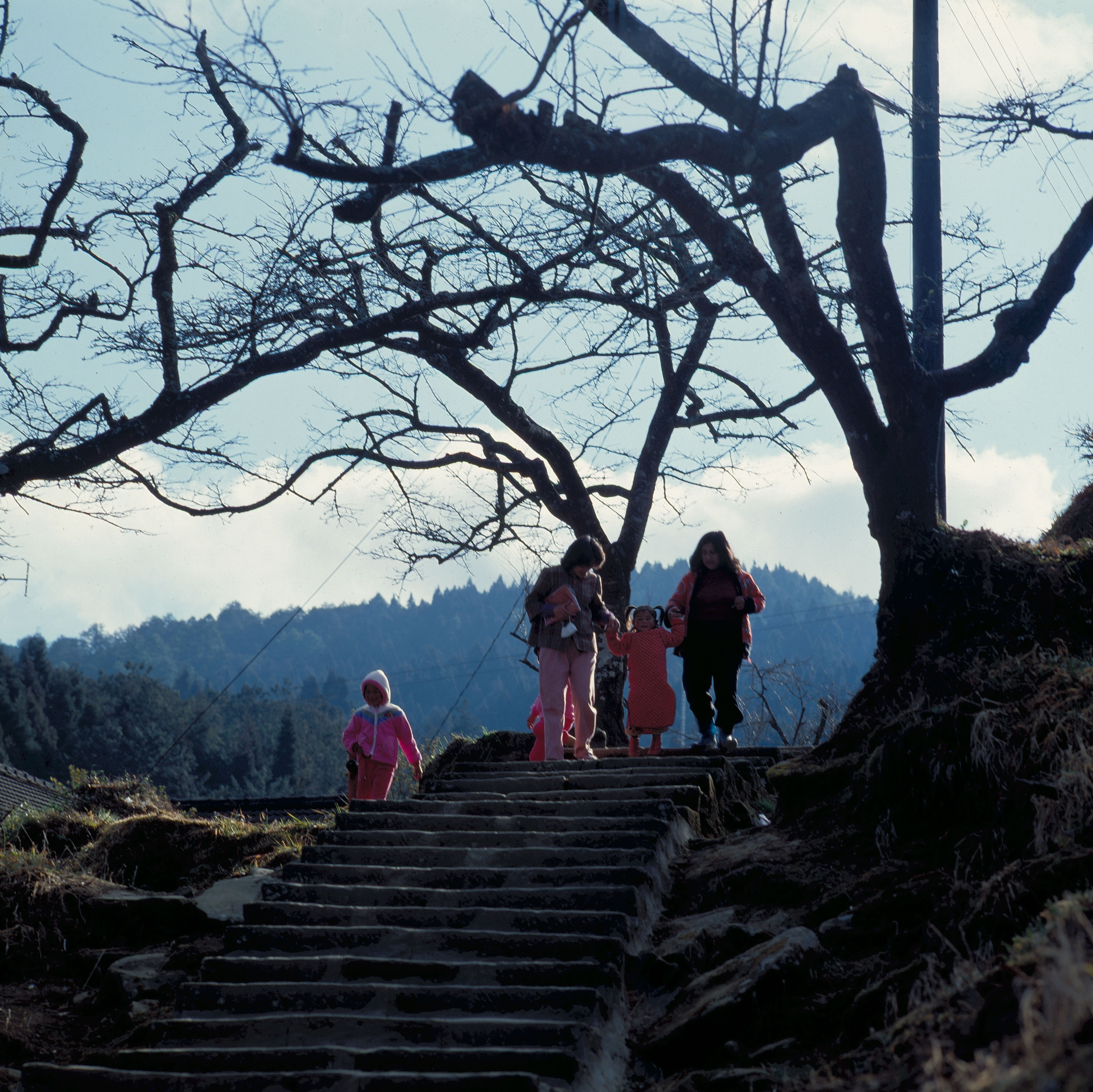 太陽出來了,阿里山高地居民攜老扶幼,享受早春溫暖的陽光。