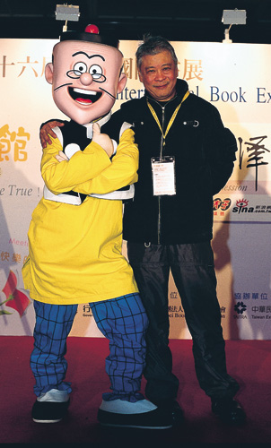 書市多半追逐新書,但出版業要可大可久,則需有長銷書的支撐,例如風行華人文化圈歷久不衰的老夫子漫畫,堪稱圖像書籍出版經典之一。圖為老夫子人偶與第二代作者王澤。