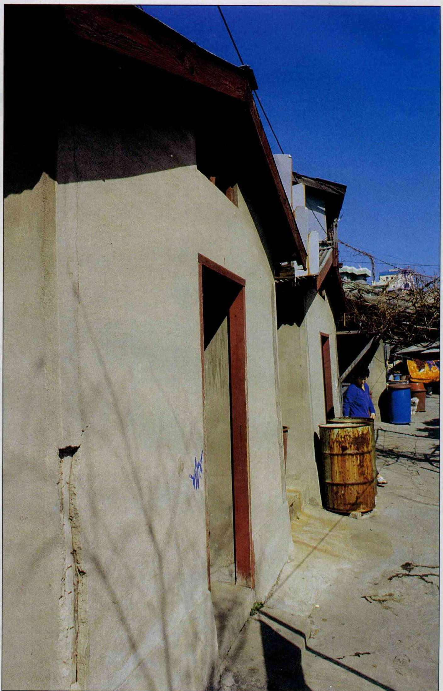 鐵皮屋頂、木板隔牆的屋子前,一個個羅列的大水桶,提供家人一天吃用。