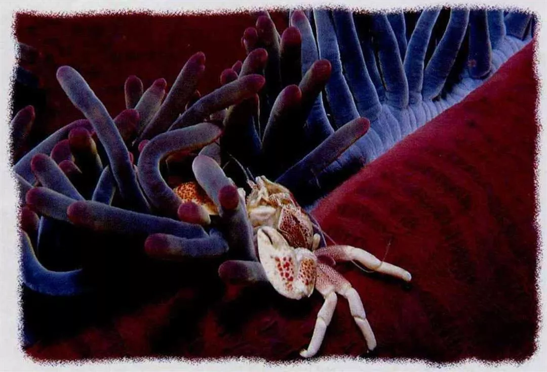 嬌小的瓷蟹正在海葵身上悠閒行走。由於海葵的長觸手是天然掩體,上面還有刺細胞可以麻醉侵敵,便成了瓷蟹棲住的家。