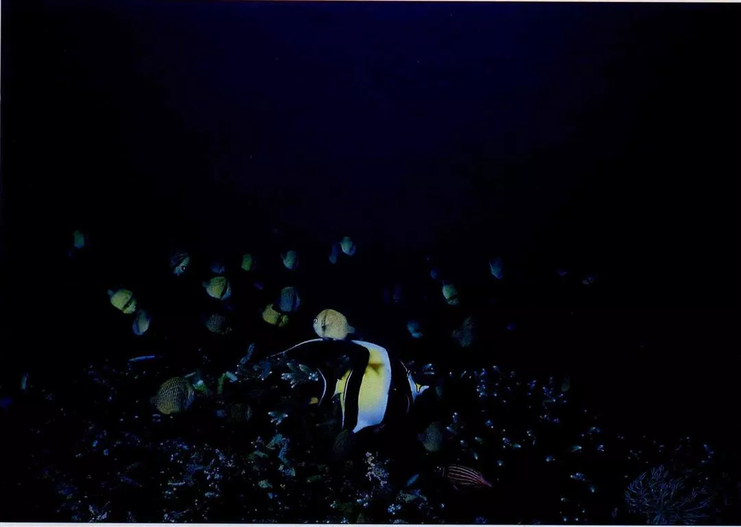 往前潛行,海床呈梯形下降,四周景緻在柔和陽光的穿透下逐漸活起來了,五彩繽紛的海底生態世界忙碌地運轉著:高低起伏的海床和海蝕溝中,狀如花樹拂柳、色彩繽紛的軟珊瑚伸出觸手隨著海流搖曳捕食;如樹枝交錯狀的軸孔珊瑚巨碩挺立;嬌小靈巧的熱帶魚群在珊瑚間穿梭覓食;各種色彩鮮豔的貝類、海螺、海百合、海葵、海膽……,以及攀附在珊瑚岩石上星星點點的藻類和旋鰓蟲,果真將整個海底世界渲染成一片熱鬧的大花園。