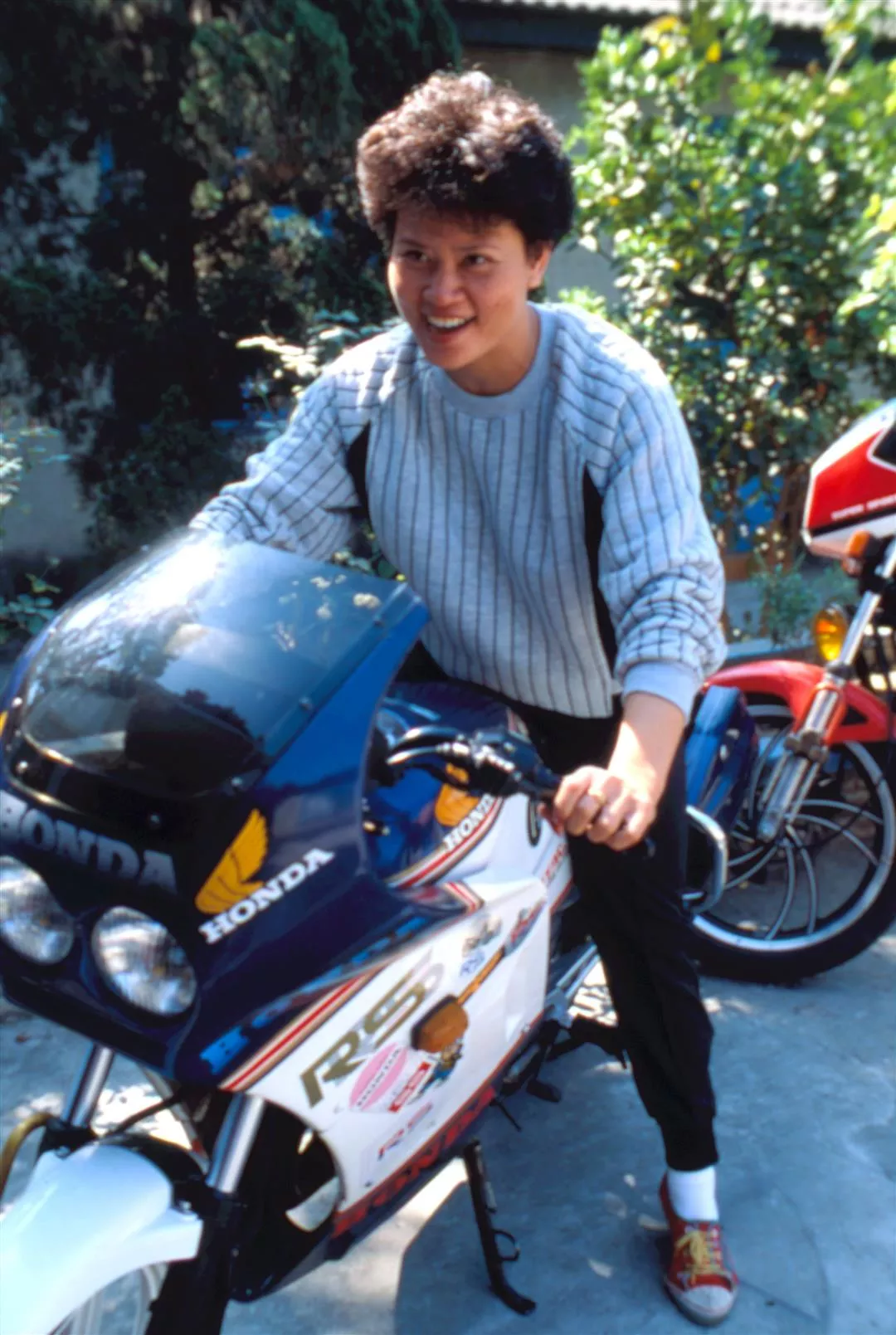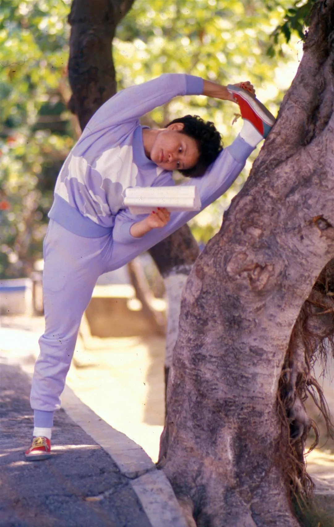 閒暇時,王海玲也不忘把腿耗在樹幹上,一面練功,一面研讀劇本。
