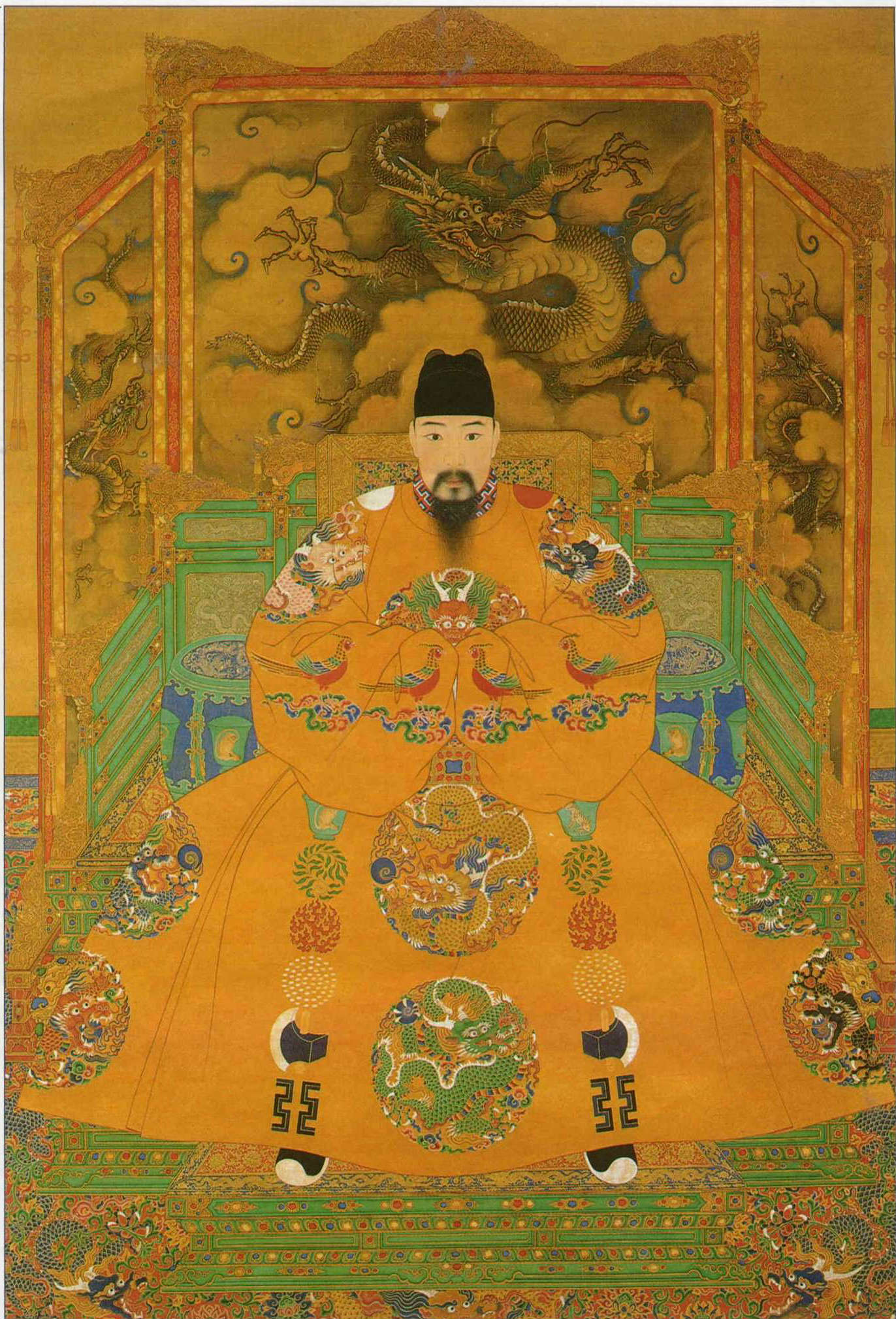 「明孝宗坐像」圖,孝宗面容仁慈、背景雍容,是宮廷畫師代表作。(故宮博物院提供)