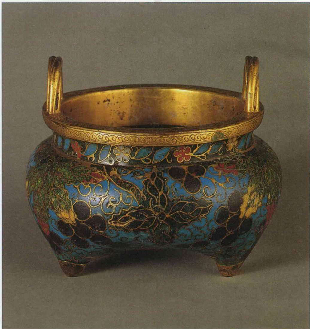 明景帝景泰年間的掐絲琺瑯器登峰造極,因而至今琺瑯器仍通稱「景泰藍」。圖為明中期的「掐絲琺瑯葡萄紋香爐」。(故宮博物院提供)