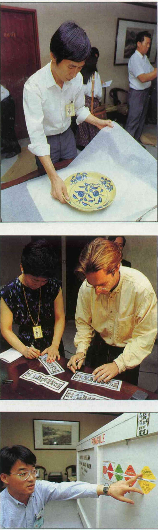 出國前一天,十八件文物自庫房提出,進行裝箱。工作人員盡除手上飾品,細細包裝。在棉紙、錦盒、氣泡墊、防水臘紙的層層包裹下,每件器物再貼上一個火柴盒大小的震動感應監視器,只要一個空香煙盒自十五公分高處落下的震動力量,監視器就會記錄反應。