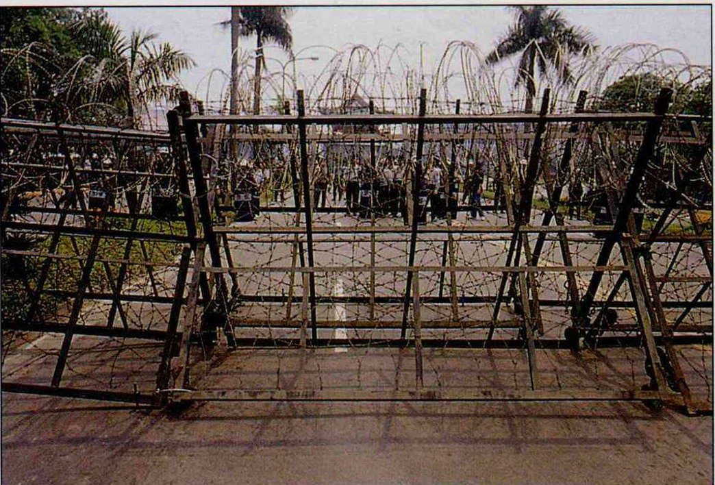 令人望而生畏的拒馬鐵刺,一度被固定擺放在重要街道旁,以備三天一遊行,五天一示威的不時之需,這兩年則少見多了。(卜華志攝)