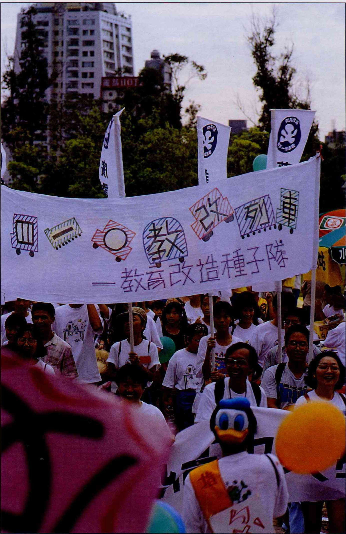 七月上旬,由「四一○教改聯盟」舉辦的遊行在全省串連展開,參加民眾神情愉快,倒像是一場嘉年華。