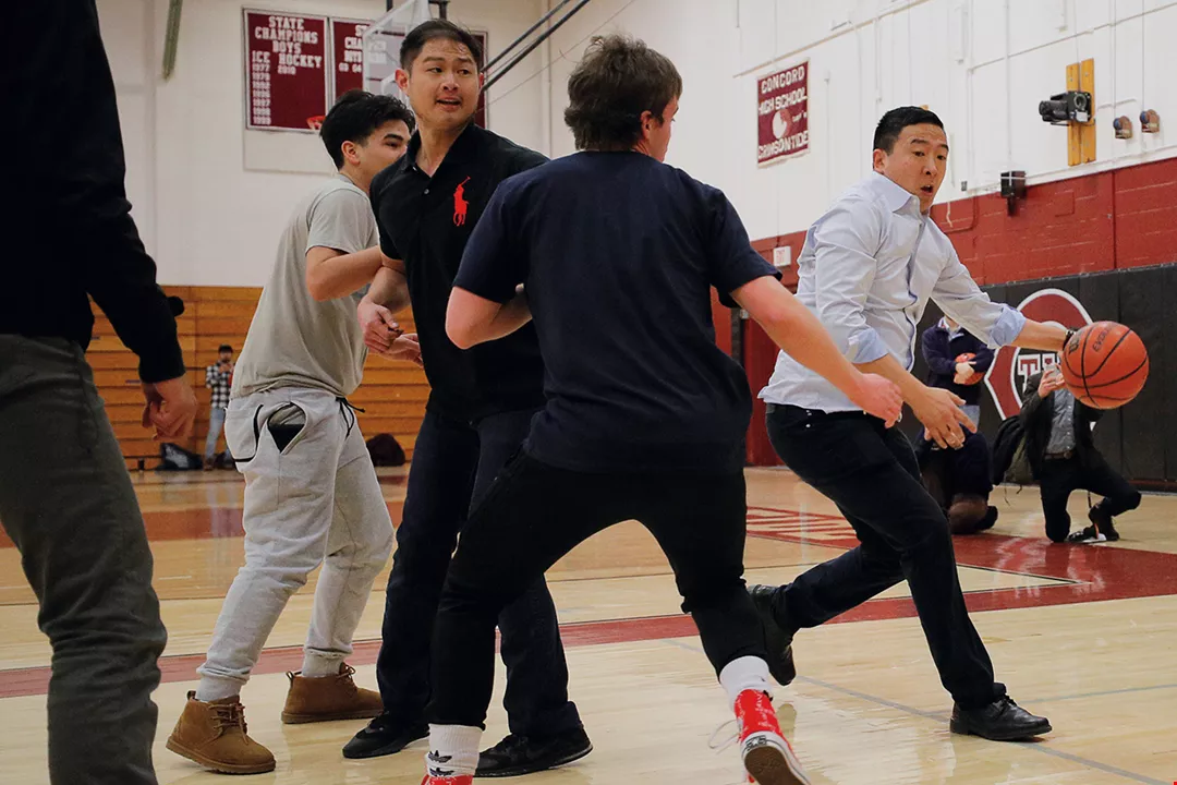 楊安澤到新罕布夏州康科德市的一處高中,與教職員、學生打籃球。(達志/路透社提供)
