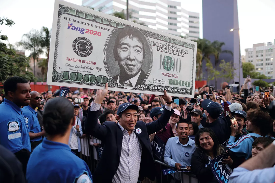 楊安澤到洛杉磯造勢,高舉他主要政見「全民基本收入」的標語,受到支持者的歡迎。(達志/路透社提供)