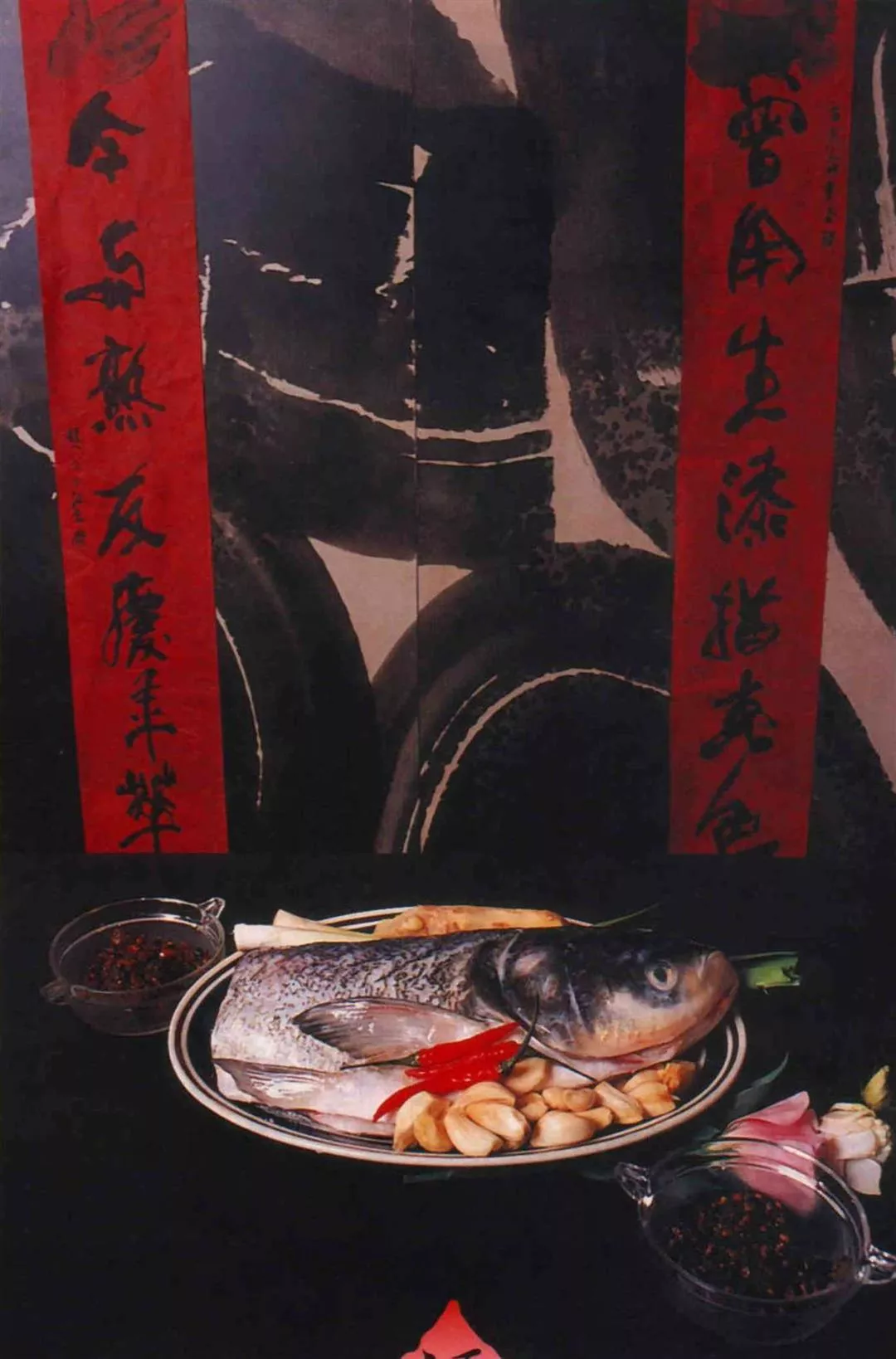 古月的招牌菜,干燒魚頭;背景襯著李錫奇的《鬱黑之旅》系列,看來很普普。