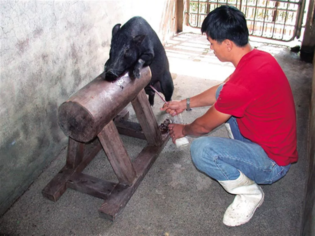 「『假』的母豬也是不錯啦!」一頭發情的雄性蘭嶼豬,雙手撐在「假母台」上,享受著人工取精的快感。