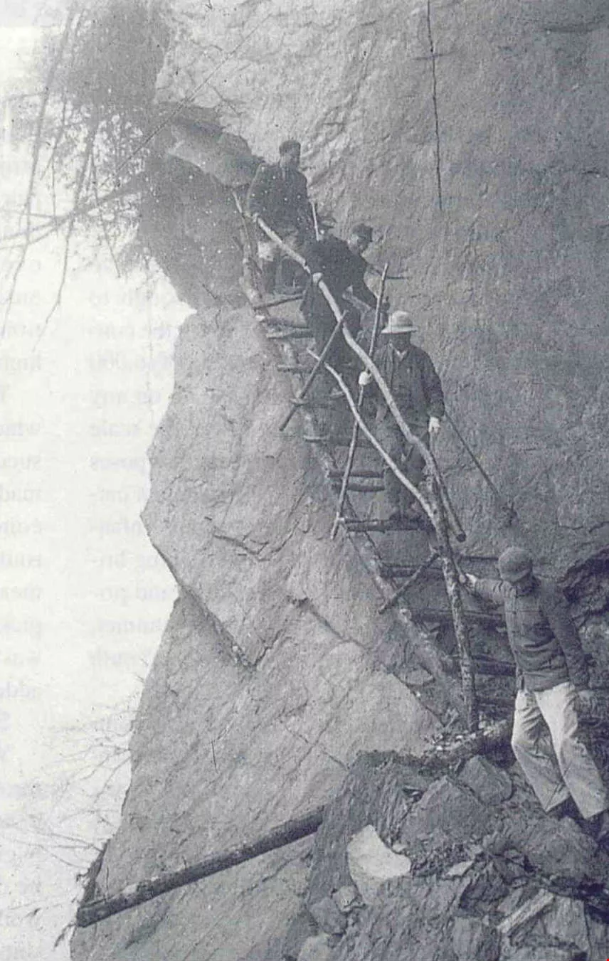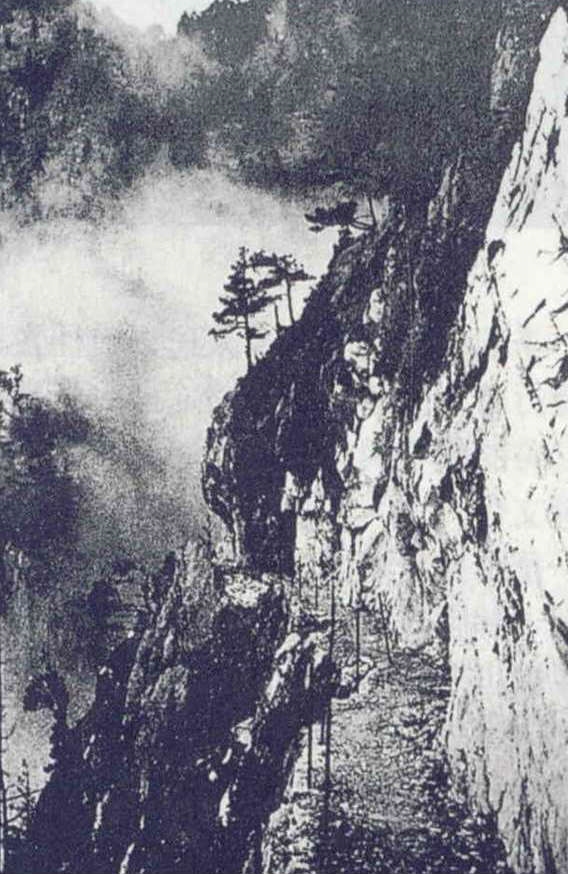 中橫公路盤旋於崇山峻嶺間,築路人往往需沿著絕直的山壁架設竹梯,以利進行工事。 (太魯閣國家公園管理處提供)(太魯閣國家公園管理處提供)