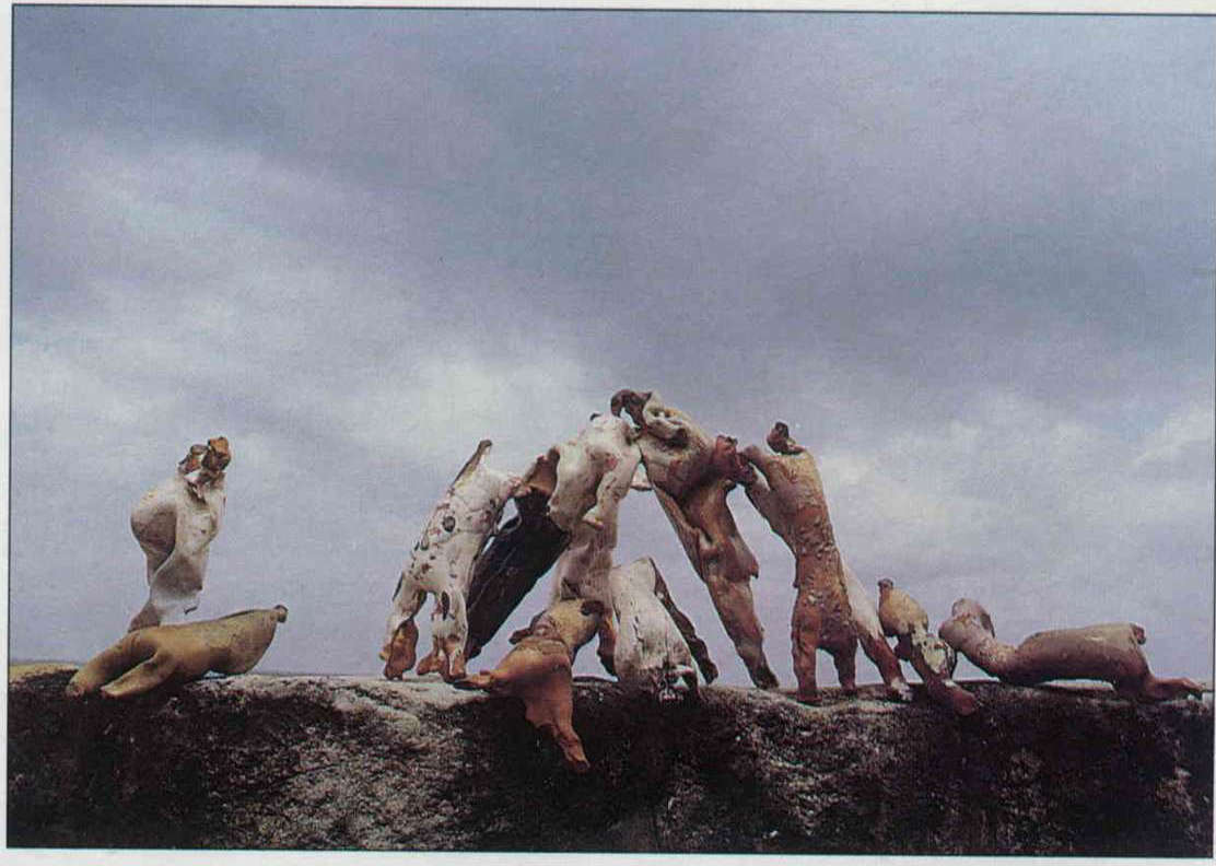 對她而言,拉坯、上釉等技術是可有可無;甚至燒或不燒都非必要。那件直接自練土機拉出,像人又像蟲的作品「必經之路」就是未經窯燒就擺在美術館的通道上,一經碰觸就破碎,展期結束,這一群蟲人以掃把、畚箕收場。「我喜歡的是創作的過程,而非結果」,她表示。