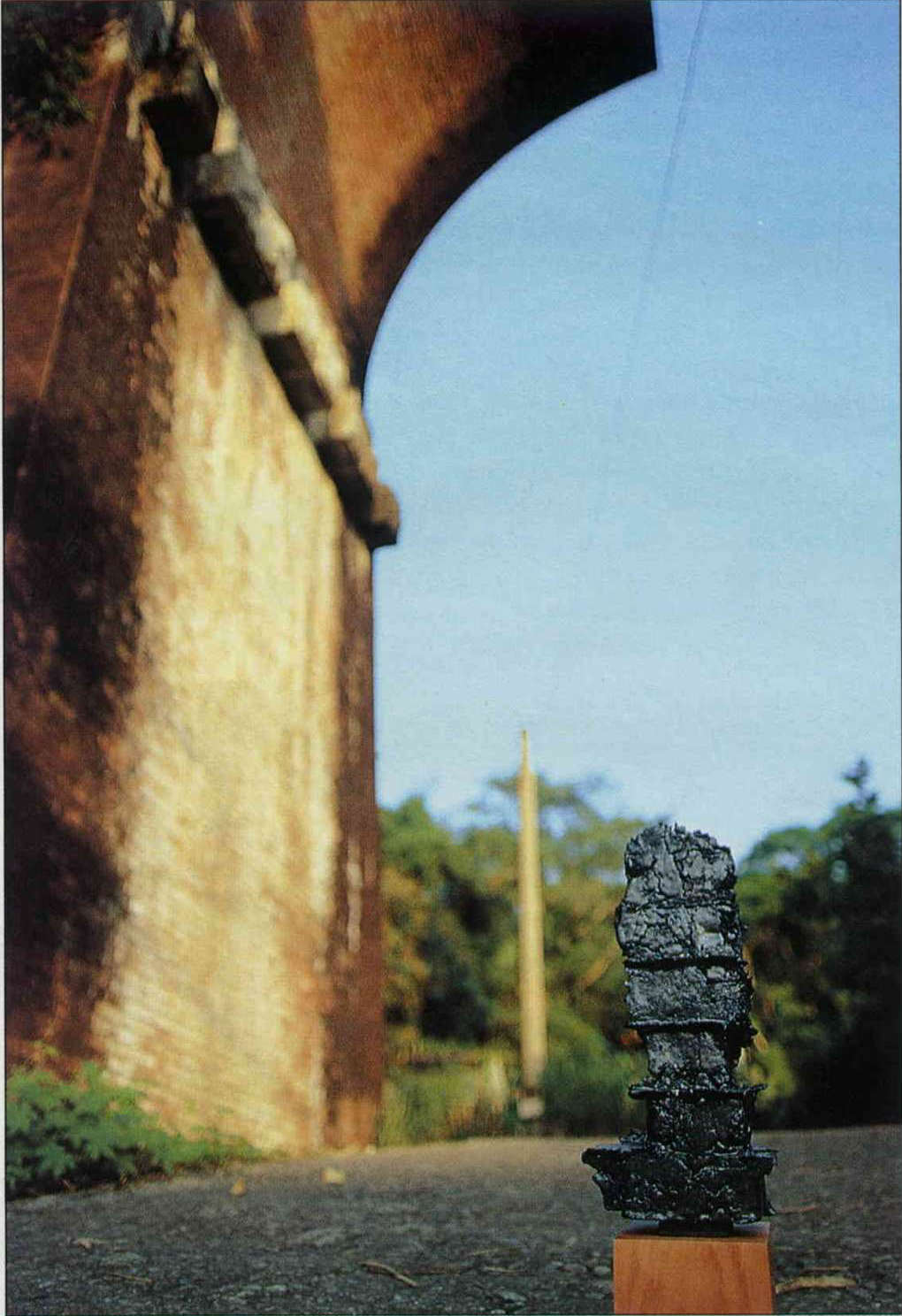 陶鐵系列一九九四52×59×24cm鐵原焠煉自土,將鐵再與土結合。不論陶鐵或陶木系列,陳正勳都在傳達「回位」的創作理念。左邊手上為其作品的小型試樣。