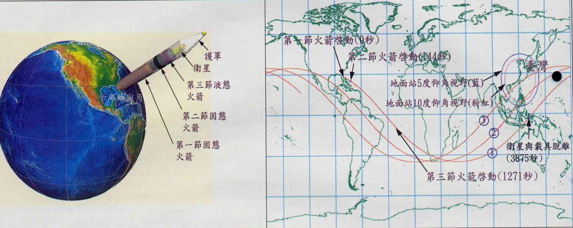 中華衛星一號是我國的第一顆人造衛星,它的成敗,攸關日後衛星科技的發展,因此深受國人關注。上四圖為電腦模擬衛星一號的發射過程。(行政院國家太空計畫室籌備處提供)(行政院國家太空計畫室籌備處提供)