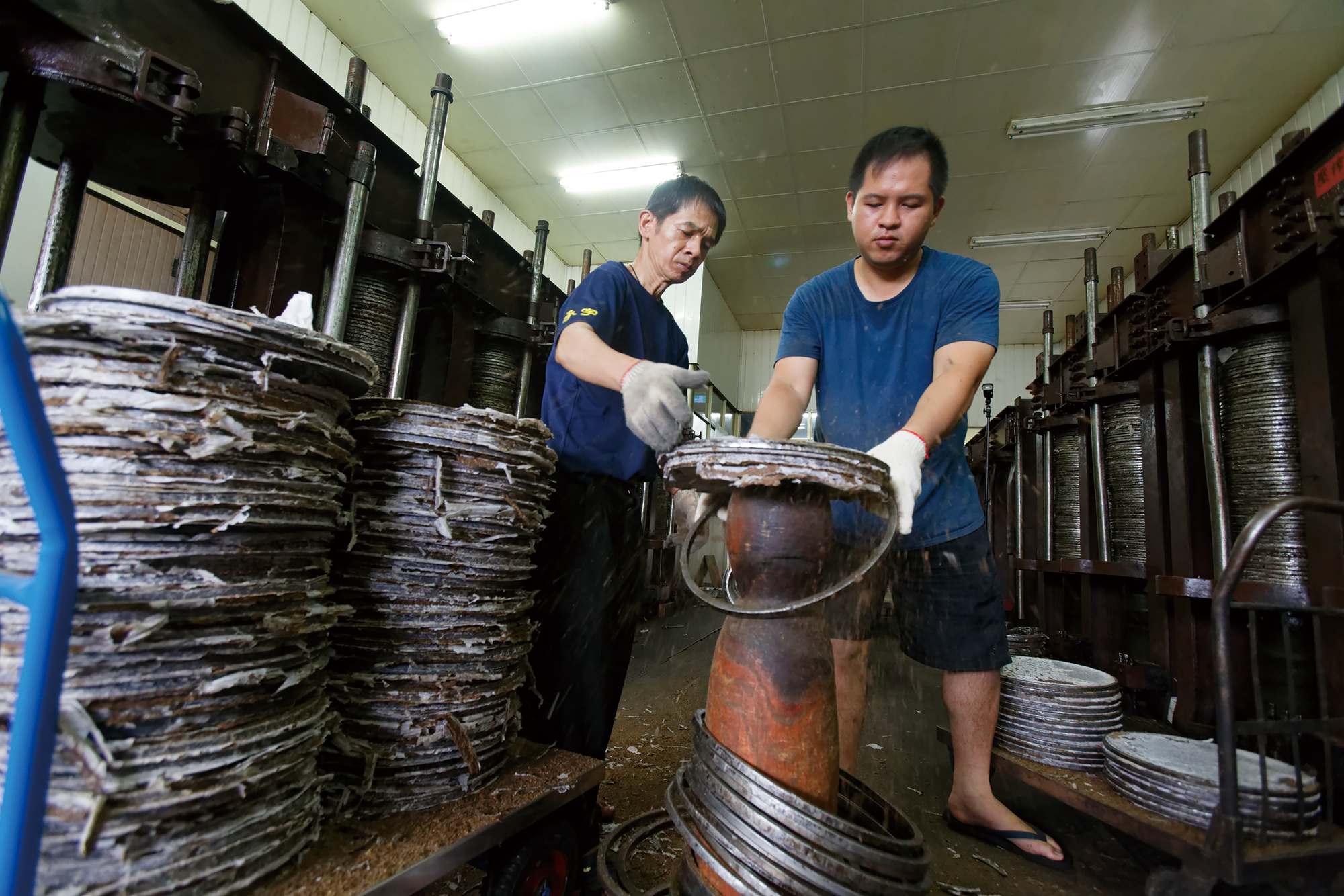 明昌油商號父子檔張閎宇(左)與張秉豪(右)合力卸下榨油過後的豆餅鐵框。