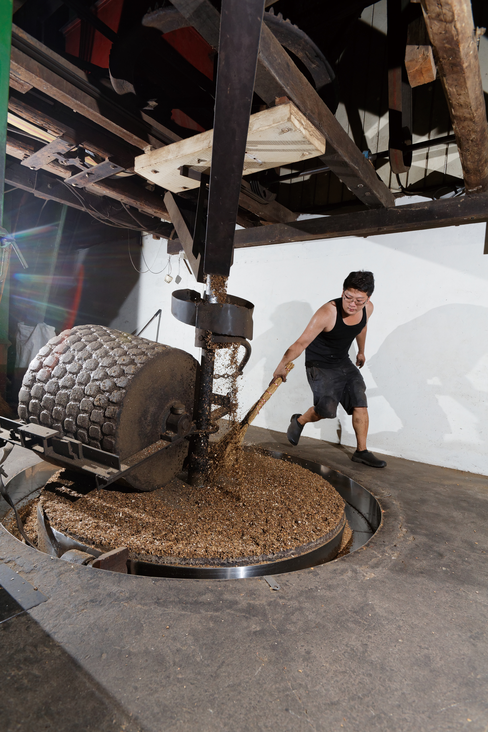 現在,廠內近二十座的榨油機具,有一半是第二代的張閎宇從父親手中傳承下來的。而其中最引人注目的是運轉時轟轟作響,重達一噸的石碖。