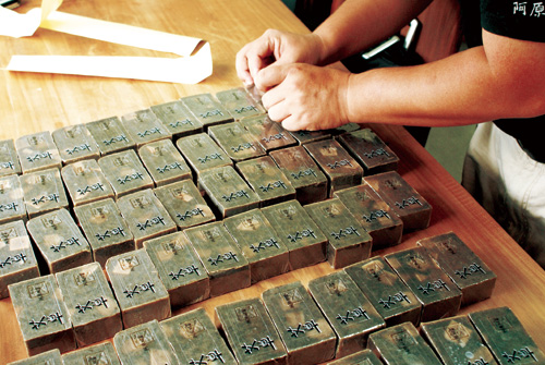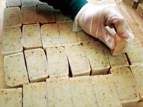 18道工序,保證純天然、純手工:取水、植草、採收、洗滌、調理、注油、攪拌、添加、塑型、皂化、脫模、乾燥、裁切、嚴選、擦拭、印記、穿衣、誕生。