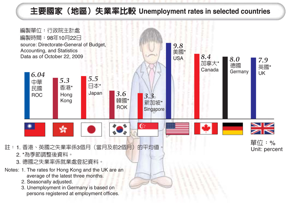 經過4個月的連續攀升、並於上(8)月創下史上最高紀錄後,9月份的失業率終於微幅下降為6.04%,失業人數為66萬1,000人。這個數字固然遠優於歐美各國,但和鄰近的日韓星港相比,仍然是最高的。(見表)