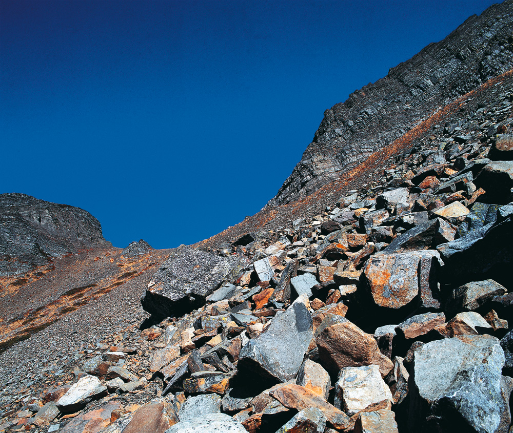 冰風化作用導致岩石崩碎,雪山圈谷的谷底和兩側山坡佈滿碎石。
